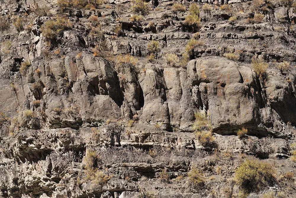 Aquí emerge una imponente pared de unos 50 metros de altura, compuesta por distintas capas de roca apiladas una sobre otra, conocidas como “estratos”. Estas capas alguna vez estuvieron a kilómetros de profundidad bajo la superficie, pero las aguas del río Maipo han erosionado este valle, haciéndolas aflorar. .