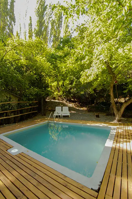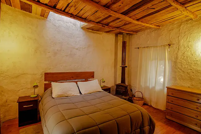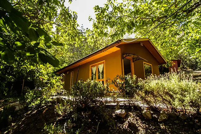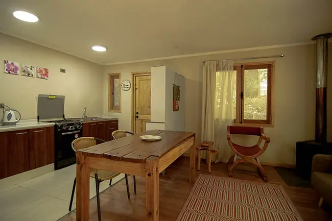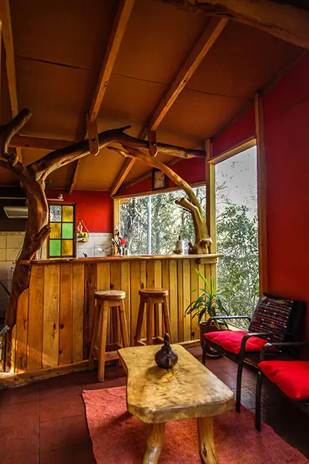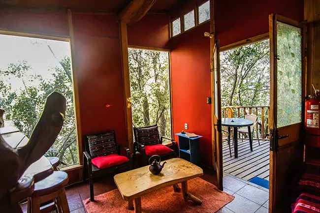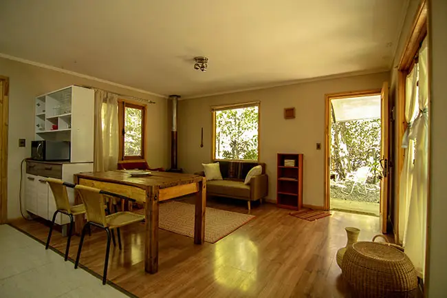 Las cabaña está emplazada en un lugar muy poco intervenido a la sombra de grandes árboles nativos y característicos del campo chileno. Corre a lo largo del lugar un riachuelo que armoniza y relaja con su pasar. La caída de las hojas, que tiñen el suelo de cálidos colores en otoño, es el panorama ideal para observar y saborear un rico chocolate caliente.